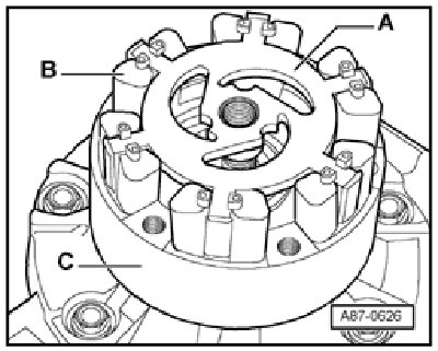 - Insert drive plate - A - with rubber elements - B - in drive plate - C - as shown until it makes contact with compressor shaft.