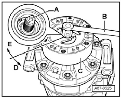 - Tighten drive plate - C - to 30 Nm by turning it with a commercially available band wrench (with webbed band) in direction of arrow - E -. Provide support for compressor shaft - A - by counterhold - B - (e.g. socket wrench T10001/10 from wrench set) to compressor shaft - A -.