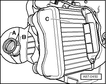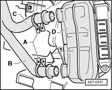 - Release clamps - A - and remove both coolant pipes - B - and - C - from the heat exchanger connections.