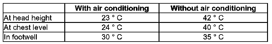 - Pleasant temperature levels (example: Mid-size car after short travelling time, ambient temperature 30 degrees C in the shade and vehicle exposed to sunlight)