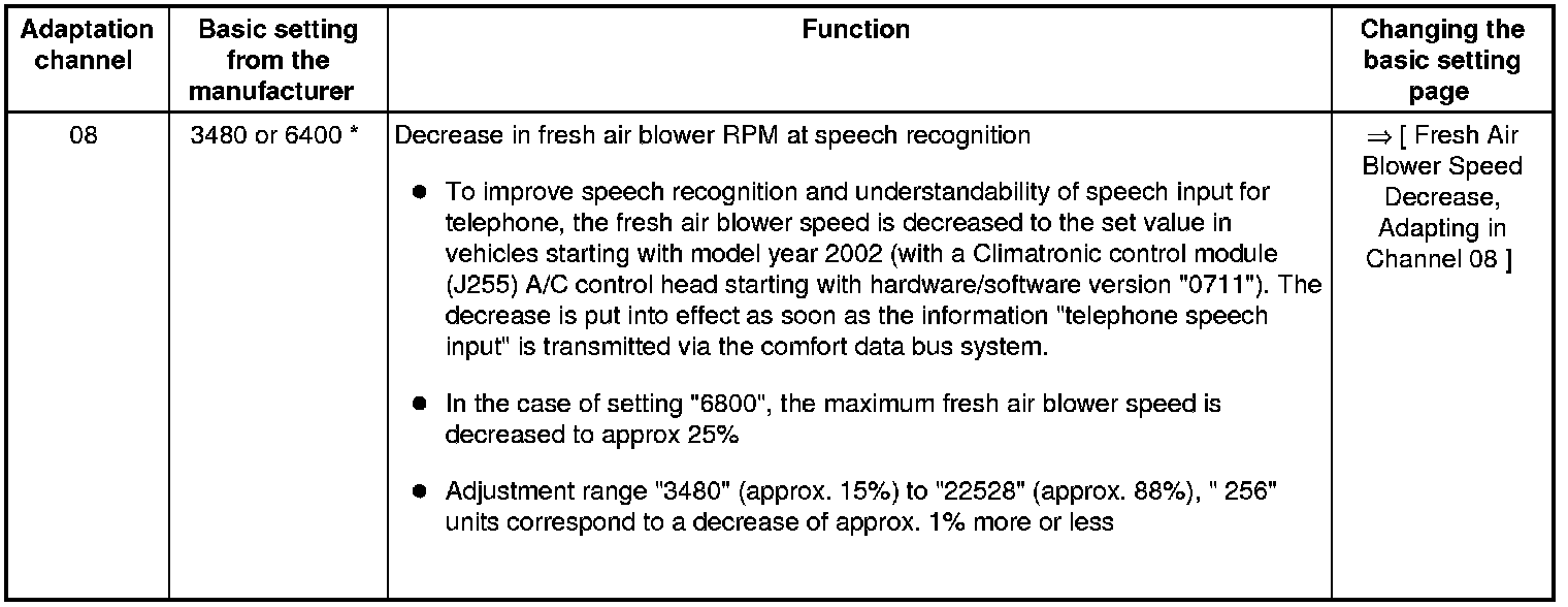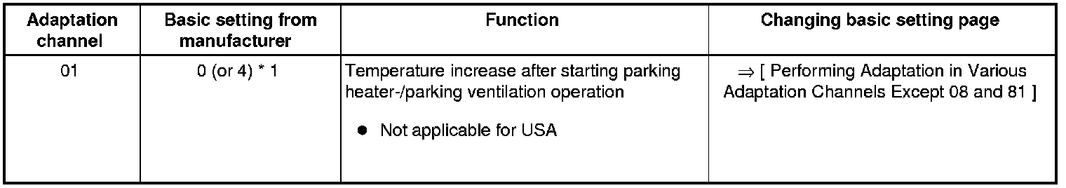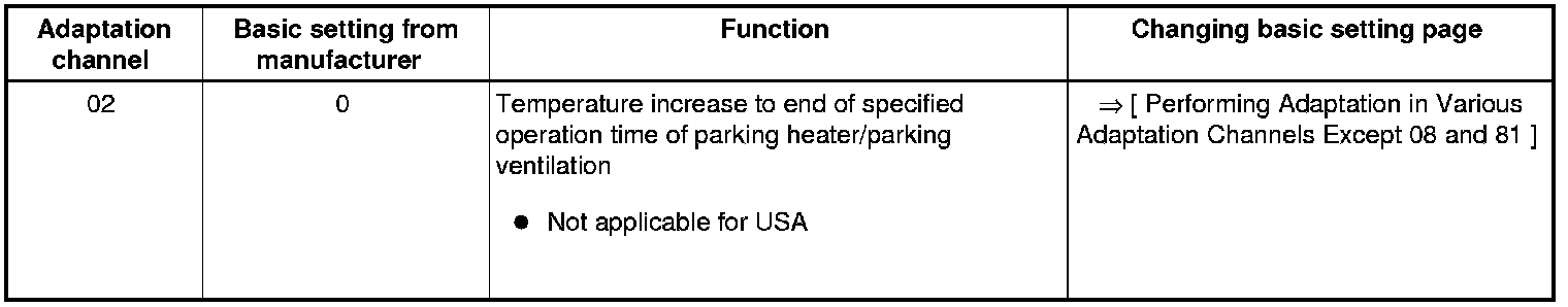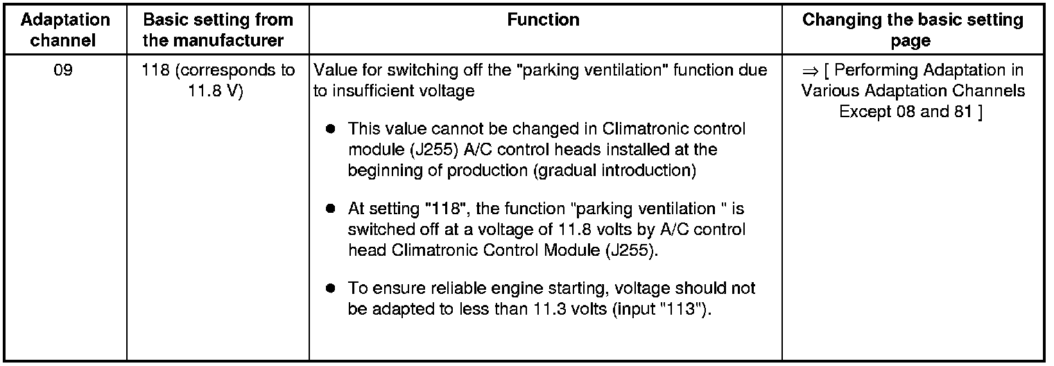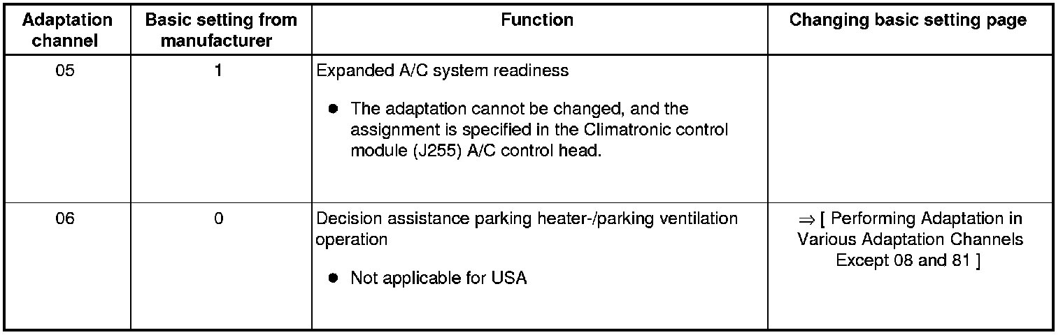 Adaptation channels "01", "02", "06 ", and "07" are in effect only for vehicles in which a parking heater is installed as optional equipment. In these vehicles, data is exchanged between the Climatronic control module (J255 ) A/C control head the auxiliary heater control module (J364), and the instrument cluster control module (J285) via the comfort data bus system. Not applicable for USA