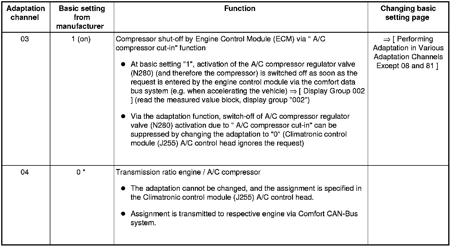If "0" is entered in adaptation channel "03", it is to be noted in the vehicle records that the activation of A/C compressor regulator valve (N280) can no longer be shut off via the "A/C compressor cut-in" function from the engine control module.