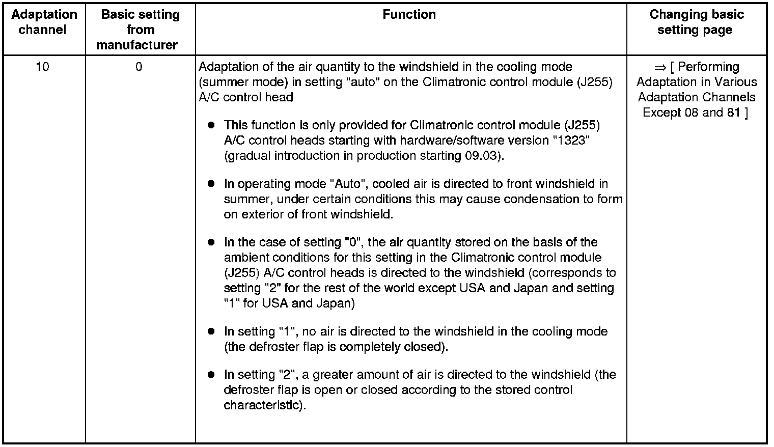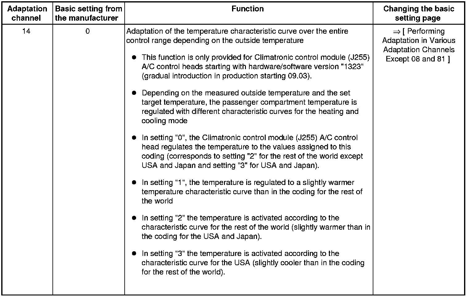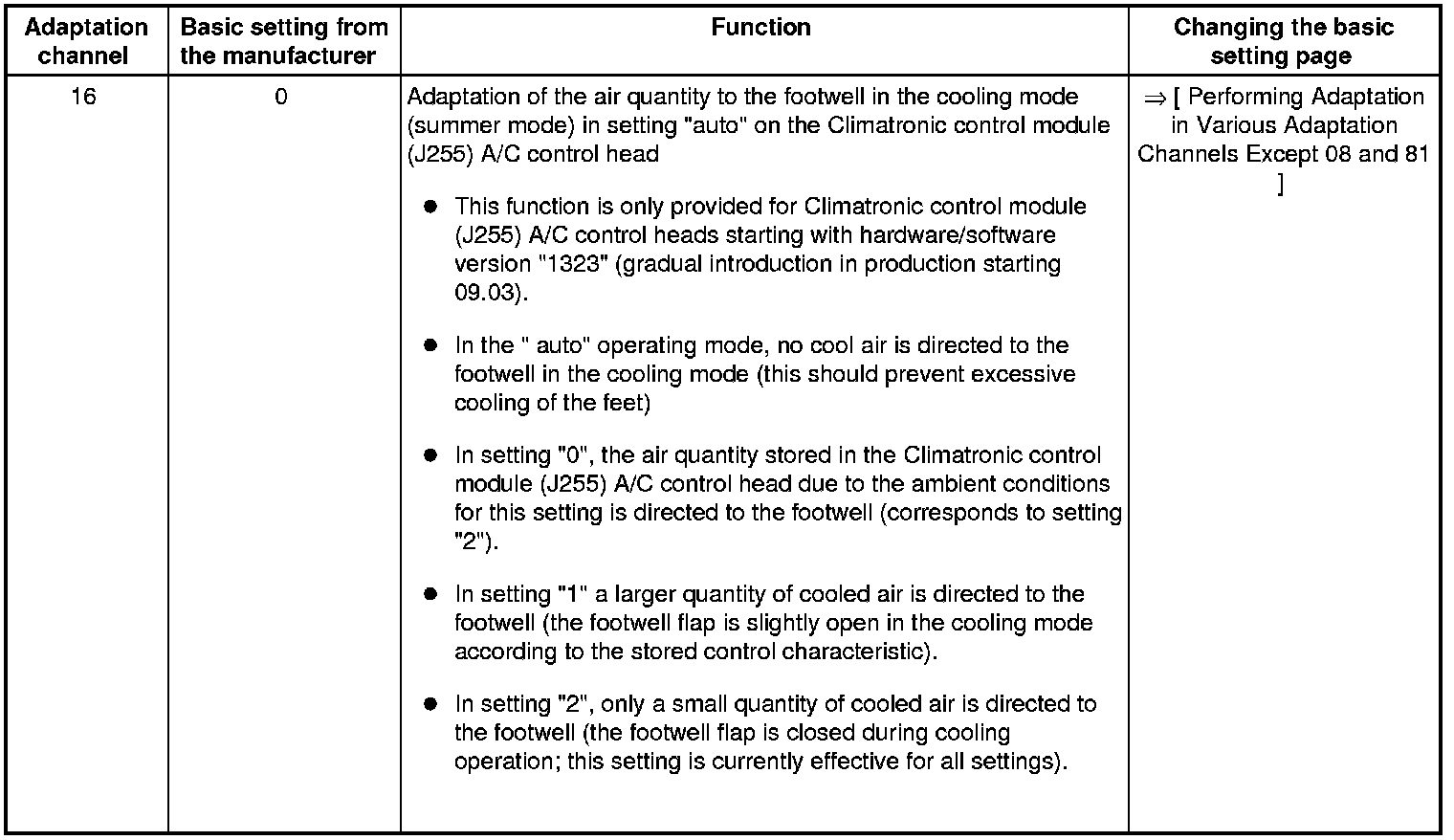 Adaptation channels "10" through "16" are only provided for a Climatronic control module (J255) A/C control head starting with hardware/software version "1323 " (gradual introduction in production from 09.03).