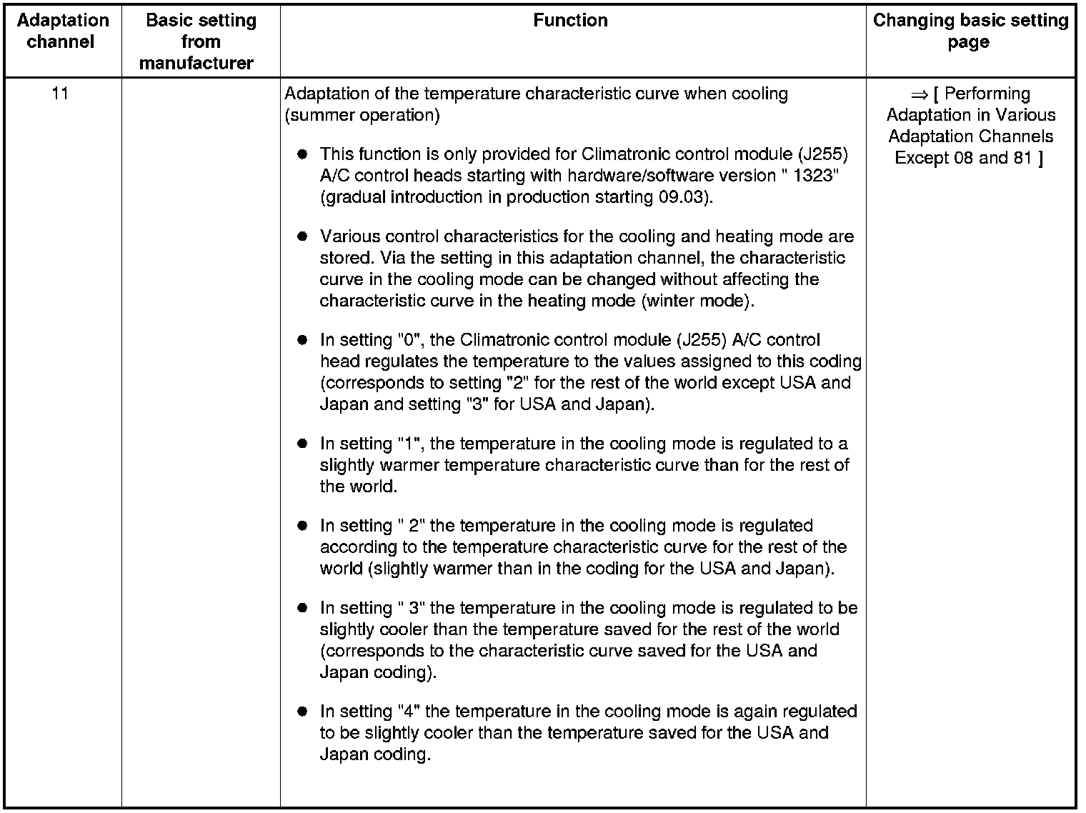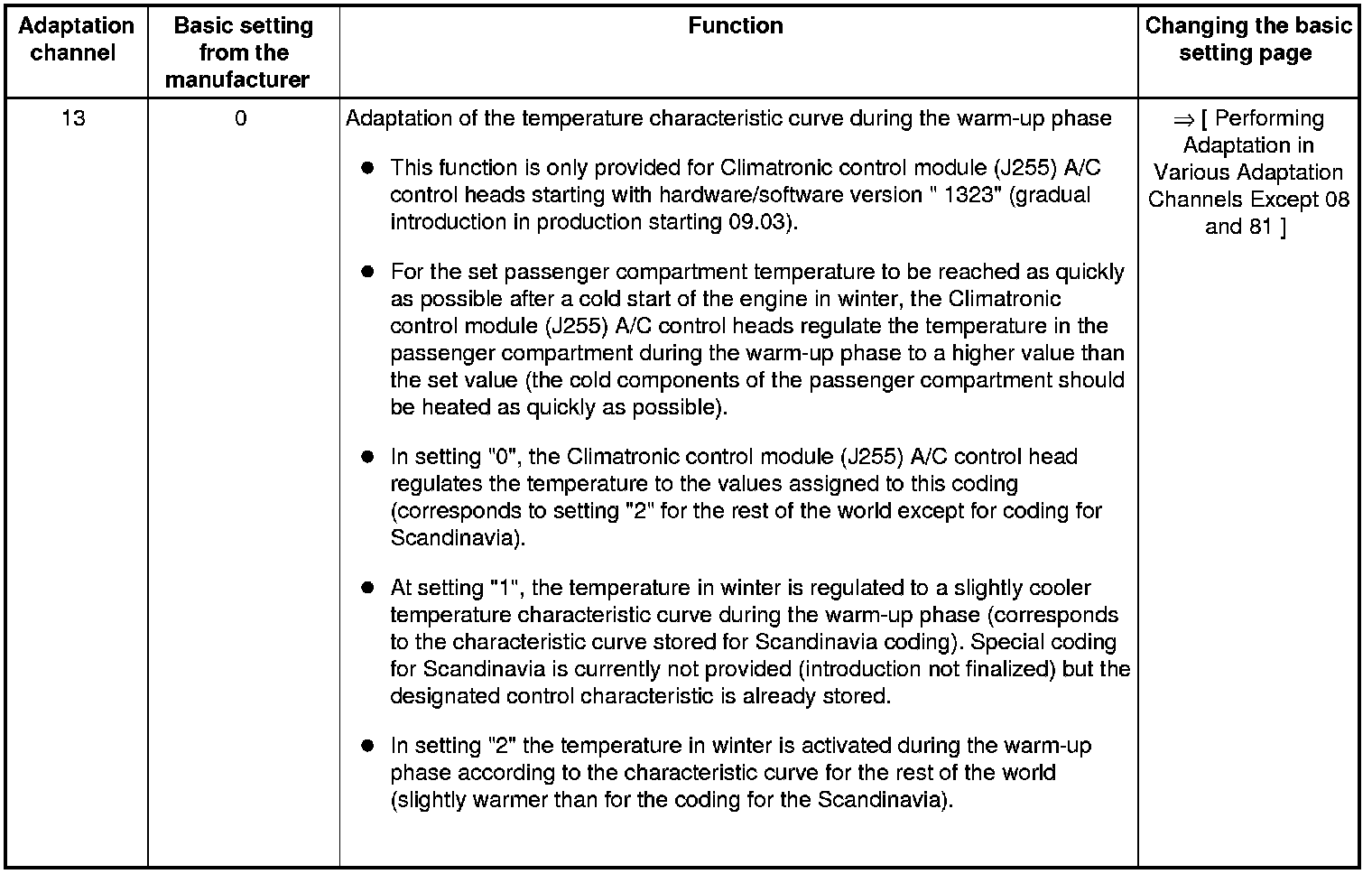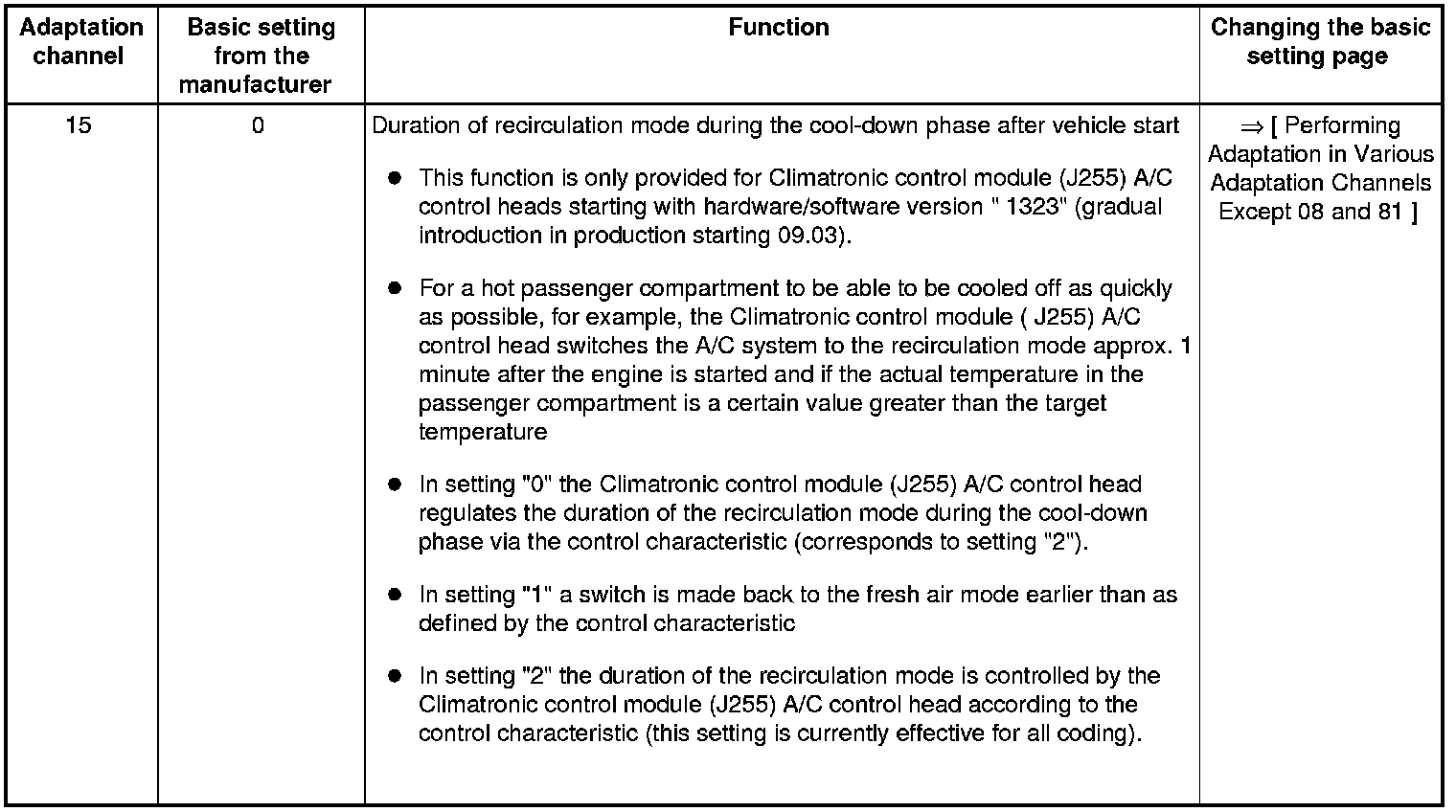 Adaptation channels "10" through "16" are only provided for a Climatronic control module (J255) A/C control head starting with hardware/software version "1323 " (gradual introduction in production from 09.03).