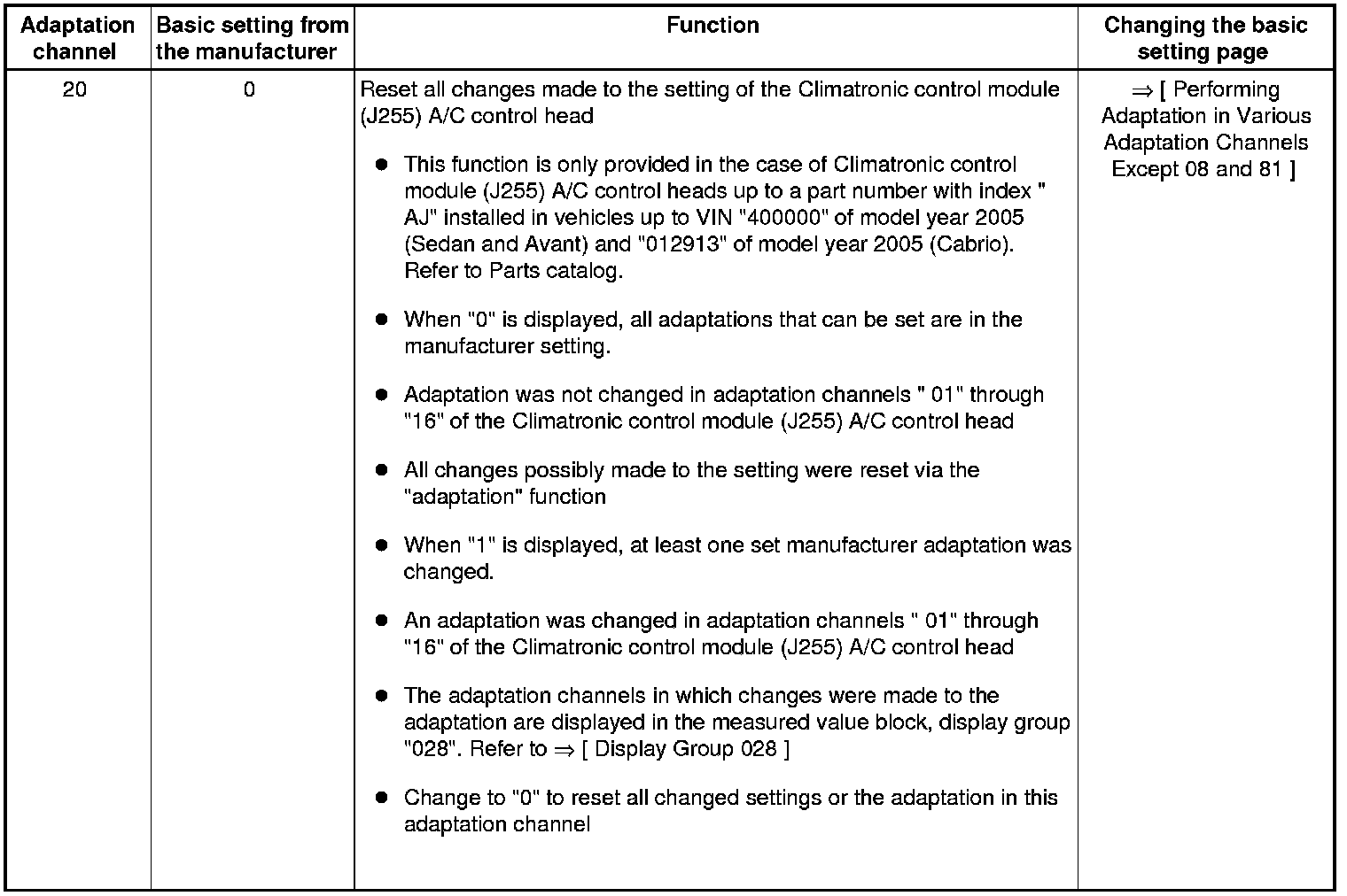 Adaptation channel "20" is only used for Climatronic control module (J255) A/C control heads with a part number from index "AJ" (provided for reset of all modified settings to the manufacturer adaptation). These Climatronic control module (J255) A/C control heads are installed in vehicles starting with VIN "400000" of model year 2005 (in the Sedan and Avant) and "012913" of model year 2005 (Cabrio).