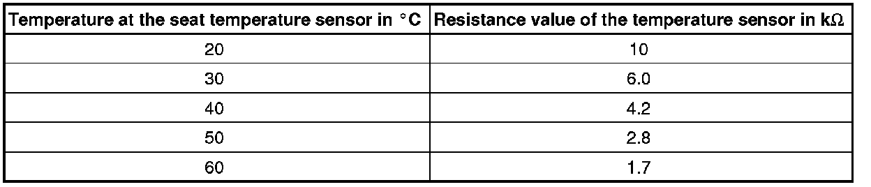 • Target value: Resistance greater than 1.5 kohms (kilo-ohms) and less than 25 kohms (depending on the temperature of the temperature sensor, the measured value is approx. 10 kohms at a seat temperature of 20°C)