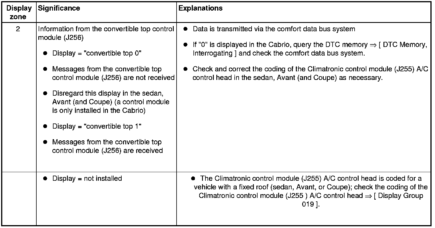 For the Audi Cabrio, different settings are stored for a closed or open convertible top in the Climatronic control module ( J255) A/C control head. When opening or closing the convertible top, the setting is automatically changed by the Climatronic control module (J255) A/C control head to the value that was last set when the convertible top was closed or open.
