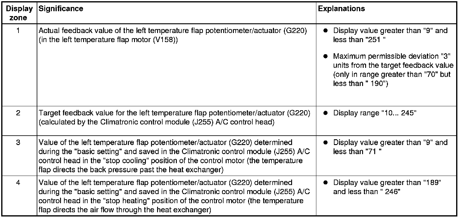 • The actual feedback value (currently between "10" and " 70" as well as between "190" and 245) is defined as the permissible tolerance range for the stop of the control motor or the flap in the Climatronic control module (J255) A/C control head.