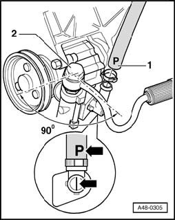 Illustration shows power steering pump and pressure line - 2 - as well as intake hose - 1 - on a 6-cylinder TDI engine. Location of pressure line and intake hose may differ from illustration on other engines.