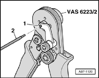 - Open securing lever on Crimping Pliers For Fiber-optic Cable VAS 6223/2 - arrow 1 - and - arrow 2 -.