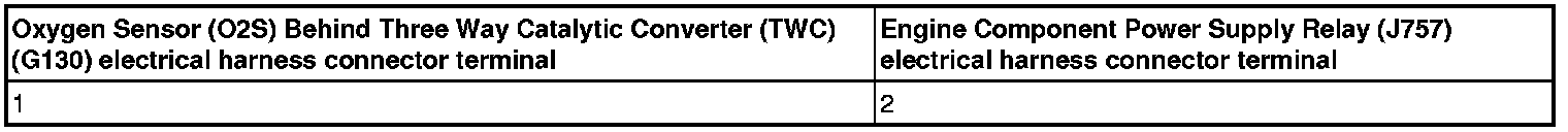 - Using a multimeter, check the Oxygen Sensor (O2S) Behind Three Way Catalytic Converter (TWC) electrical harness connector terminal 1 to Engine Component Power Supply Relay (J757) terminal 2/87 for voltage.