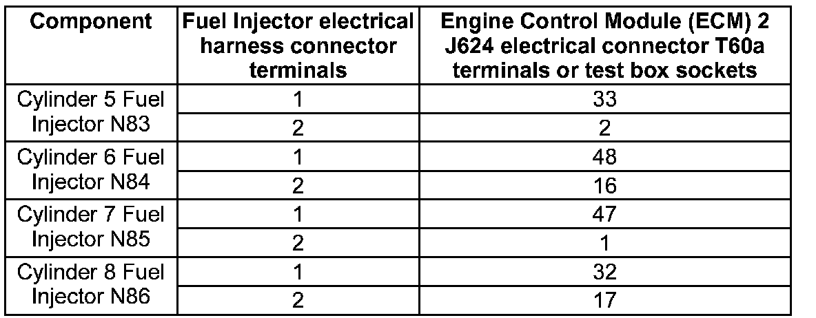 - Using a Multimeter , check the electrical harness connector terminals of the Fuel Injector to be tested to the Engine Control Module (ECM) 2 J624 electrical harness connector T60a terminals for an open circuit.