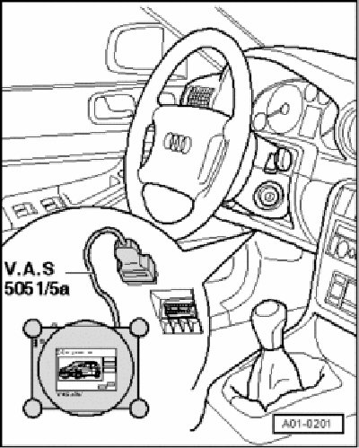 - Vehicle Diagnostic, Testing and Information System VAS 5051 with diagnostic cable VAS 5051/5 A connected, On-board diagnostics and Data Link Connector DLC "01 Engine electronics" selected.