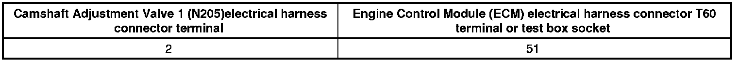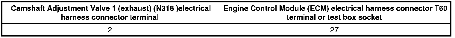 - Using a Multimeter, Check the Camshaft Adjustment Valve electrical harness connector terminal 1 to the Engine Control Module (ECM) Power Supply Relay (J271) terminal 2/87 for voltage.