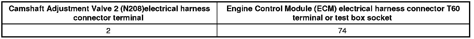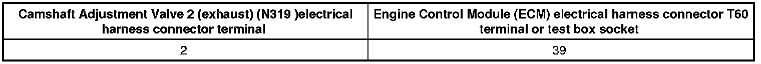 - Using a Multimeter, Check the Camshaft Adjustment Valve electrical harness connector terminal 2 to the Engine Control Module (ECM) (J623) electrical harness connector T60 terminal for an open circuit.