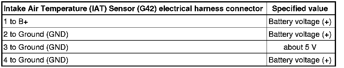 - Using a Multimeter, check the Intake Air Temperature (IAT) Sensor (G42) electrical harness connector for voltage.