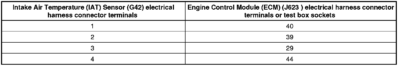- Using a Multimeter, check the Intake Air Temperature (IAT) Sensor (G42) electrical harness connector terminals to the Engine Control Module (ECM) (J623) electrical harness connector terminals for an open circuit.