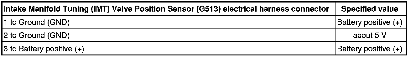 - Using a Multimeter, check the Intake Manifold Tuning (IMT) Valve Position Sensor (G513) electrical harness connector for voltage.