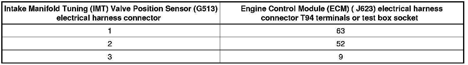 - Using a multimeter, check the Intake Manifold Tuning (IMT) Valve Position Sensor (G513) electrical harness connector terminals to the Engine Control Module (ECM) (J623) electrical harness connector T94 terminals for an open circuit.