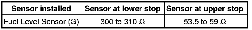 • With Fuel Level Sensor (G) removed, the following values are obtained because of the greater deflection of the floater arm: