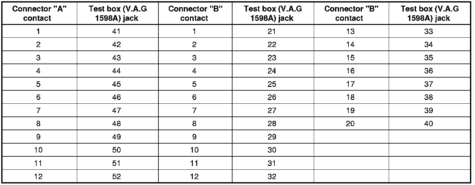 The contact assignment of connectors "A" and "B " in the adapter cable (V.A.G 1598/11) is not identical to the jack assignment at the test box (V.A.G 1598A).