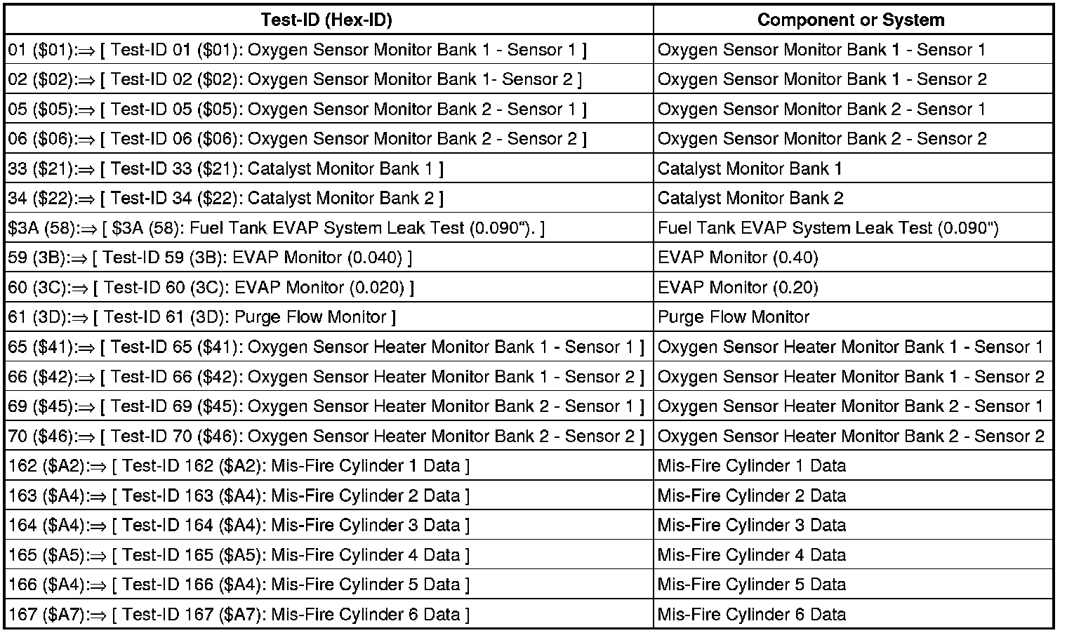 • Depending on scan tool and protocol used, the information displayed may be referred to by different names such as Test-ID (TID), Hex-ID, Component-ID (CID), On-Board Diagnostic Monitor Identifier (OBDMID), or contain no name at all and be referenced by only a number.