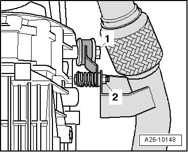 - Remove nut - 2 - at right bracket for front exhaust pipe.