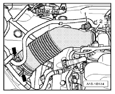 - Remove air duct hose, thereby loosening hose clamp - 2 - and opening clips - arrows -