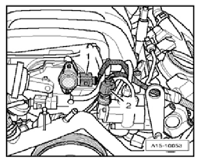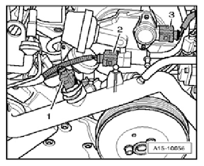 - Disconnect electrical connectors at Engine Coolant Temperature (ECT) Sensor G62 - 1 - and Intake Manifold Flap Change-over Valve N239 - 2 -.