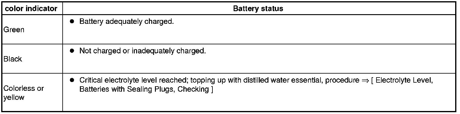 - Electrolyte level on batteries with charge indicator - arrow - can be established from the color indication. Three different colored displays are possible: