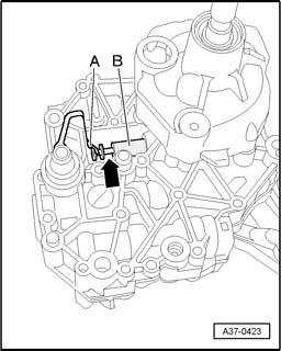 ^ Locating tab - B - must be inserted into hole intended for it on the transmission.