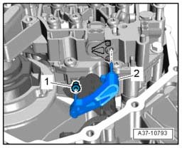 - Pull selector lever lock mechanism lever - 2 - downward out of bearing hole of hydraulic control module. When doing so, pay attention to roller - 1 -.
