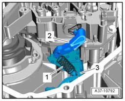 - Unhook spring - 1 - on the slider for selector lever position - 2 - and on selector shaft - 3 -.