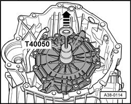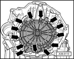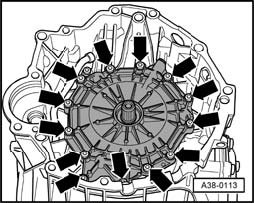 - Check whether bushings - arrows - for centering flange cover on transmission housing are installed and seated securely.