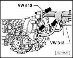 - Bolt transmission onto engine/transmission holder VW 540 - arrows -.