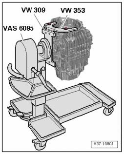 - Attach the holding plate VW 309 to the transmission support VW 353.