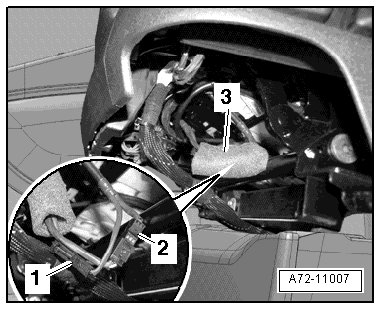 - On vehicles with belt fastened detection: press the tab on the belt fastened detection connector - 2 - on the tunnel side in and remove the connector - 2 -.