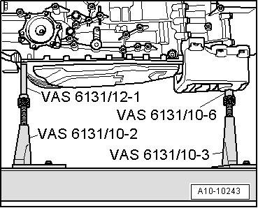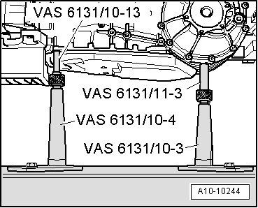 - Position support elements from (VAS 6131/10) and (VAS 6131/11) at right on transmission as shown in illustration.
