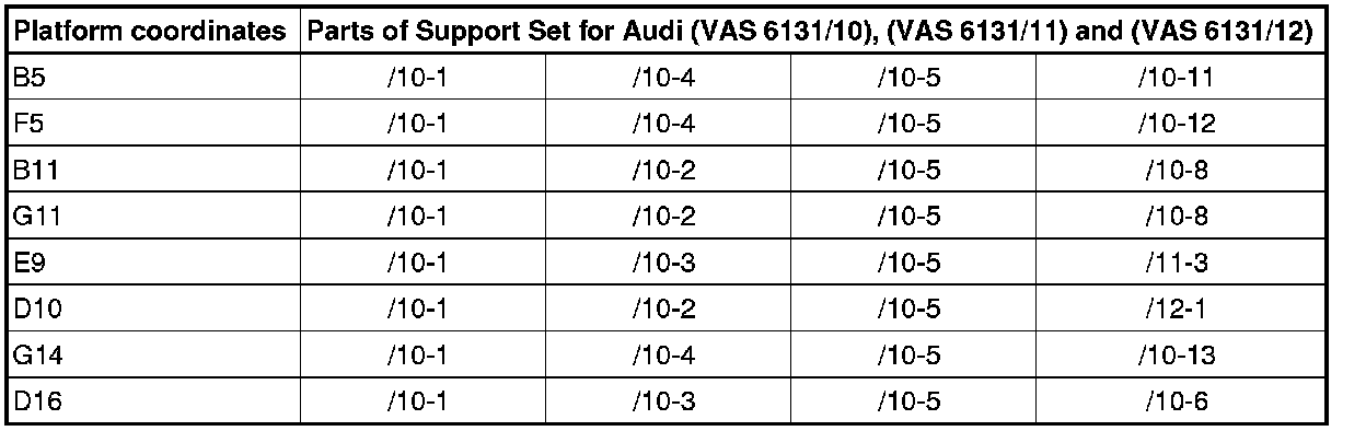 - Equip Scissor Lift Platform (VAS 6131 A) with Support Set for Audi (VAS 6131/10), (VAS 6131/11) and (VAS 6131/12) as follows: