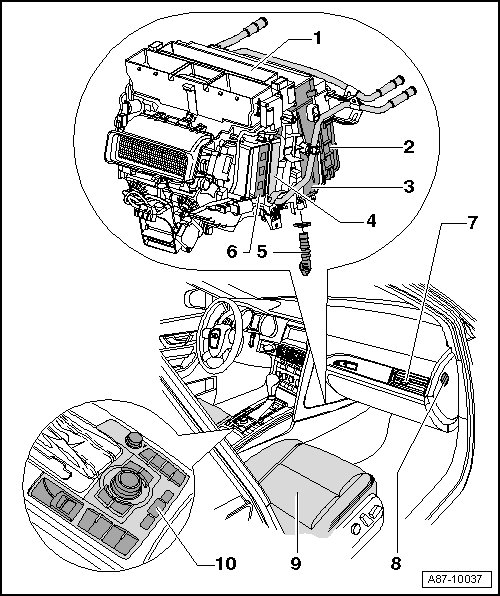 To enable the selected A/C system functions to be displayed at the MMI display, the correct versions of the Climatronic Control Module (J255) A/C control head and MMI control module have to be installed => [ (Item 11) A/C control head of A/C system ] Left Side A/C System Control and Regulation Components.