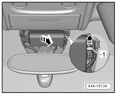 - Press the retaining clamp - 1 - forward in the - direction of the arrow - and remove the directional stabilization assistance control module (J759) sideways and down from the bracket.