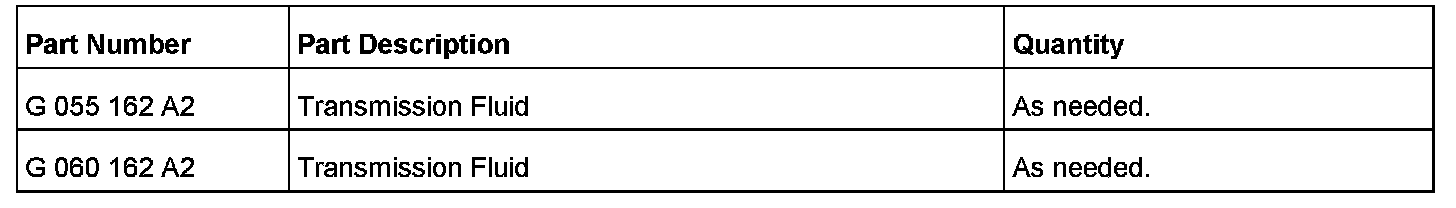 5. Bring transmission up to temperature then drain and fill ATF with blue (G 055 162 A2) or green (G 060 162 A2) fluid.
