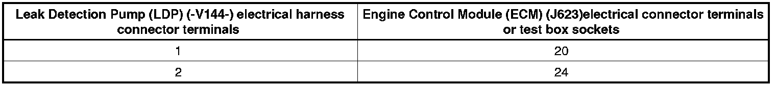- Using a Multimeter, check the Leak Detection Pump (LDP) (-V144-) electrical harness connector terminal 1 to Engine Control Module (ECM) (J623) electrical harness connector terminal 20 for resistance.
