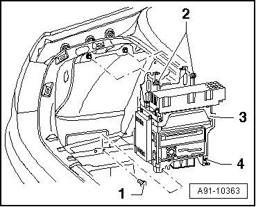 - Loosen nuts - 2 - and - 4 - (5 Nm) and screw - 1 - (5 Nm) on Infotainment rack - 3 -.