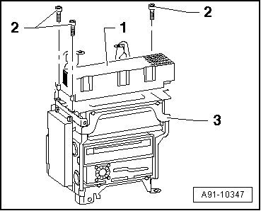 - Remove the screws - 2 - (4 Nm) and remove digital sound system control module - 1 - from rack - 3 -.