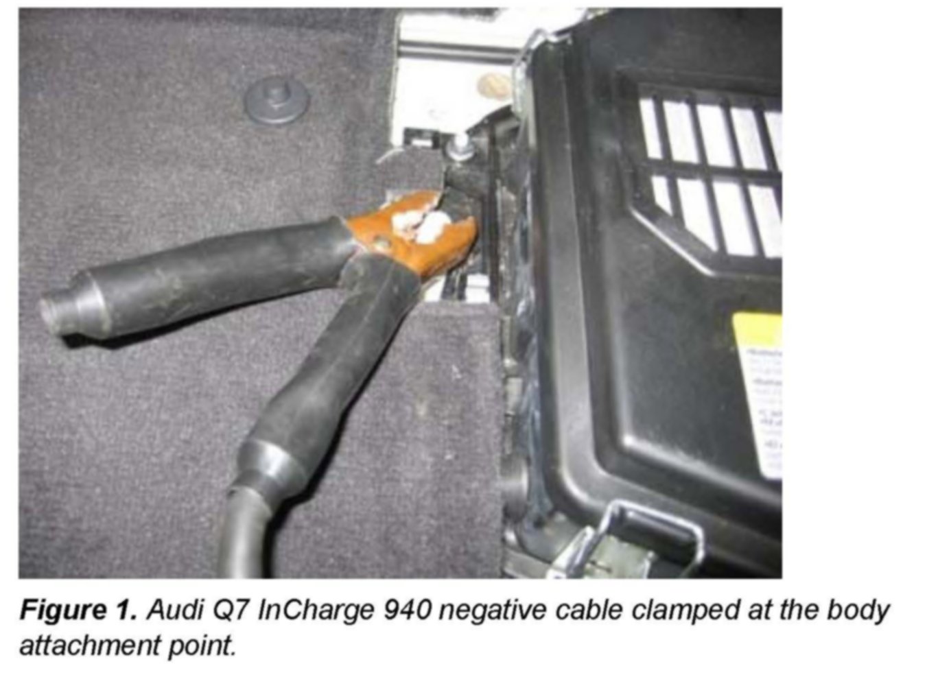 2. Connect the negative cable clamp to the vehicle's negative battery cable downstream at the body attachment point. (Figure 1 illustrates this on an Audi Q7 model).