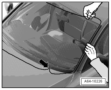 - When pressing in drip rail, make sure sealing lip - arrow - lies flat against windshield and does not slip behind edge of windshield.