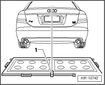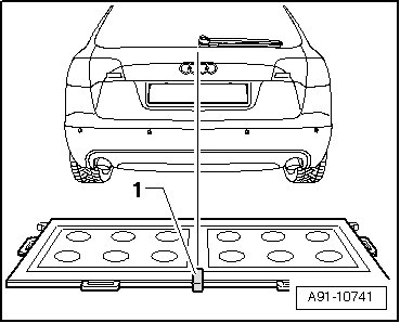 - Switch on the line laser - 1 - on the calibration device and then align the calibration device so that the laser beam from the line laser is pointed to the center of the Audi rings.