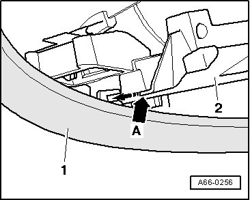 - When installing, locking tab (arrow - A -) of mirror adjusting unit - 2 - must be inserted into mirror housing catches - 1 - in direction of - arrow -.