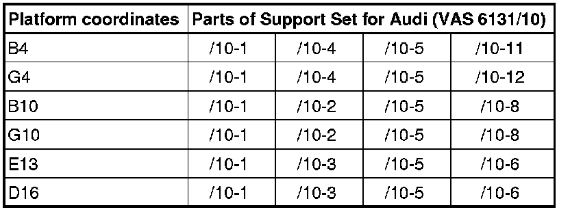 - Equip Scissor Lift Platform (VAS 6131 A) with Support Set for Audi (VAS 6131/10) as follows: